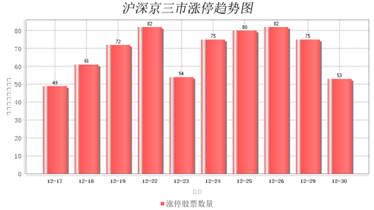今日沪深京三市一共53支股票涨停,较上一个交易的75支减少22支。
