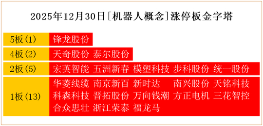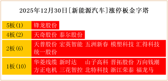 一共有19支个股涨停。其中,锋龙股份5板;天奇股份、泰尔股份4板;天普股份、宏英智能、五洲新春、模塑科技、汇得科技、统一股份2板;华菱线缆、新时达、山子高科、晋拓股份、万向钱潮、方正电机、三花智控、北特科技、浙江荣泰、福龙马1板。