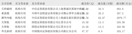 今日大宗交易榜单中出现机构买入席位的个股为:美的集团、福晶科技、飞龙股份、华森制药、若羽臣、舒泰神、中际旭创、汉宇集团、景嘉微、新易盛、晨曦航空、宁德时代、新产业、南凌科技、恒辉安防、蓝箭电子、无线传媒、达利凯普、黄山谷捷、宝胜股份、天和磁材、希荻微、澳华内镜、天智航、华光新材、华海诚科、达梦数据。