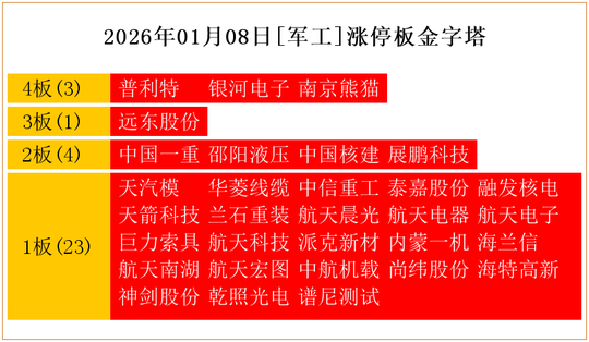 一共有31支个股涨停。其中,普利特、银河电子、南京熊猫4板;远东股份3板;中国一重、邵阳液压、中国核建、展鹏科技2板;天汽模、华菱线缆、中信重工、泰嘉股份、融发核电、天箭科技、兰石重装、航天晨光、航天电器、航天电子、巨力索具、航天科技、派克新材、内蒙一机、海兰信、航天南湖、航天宏图、中航机载、尚纬股份、海特高新、神剑股份、乾照光电、谱尼测试1板。