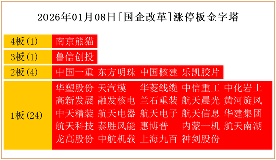 一共有30支个股涨停。其中,南京熊猫4板;鲁信创投3板;中国一重、东方明珠、中国核建、乐凯胶片2板;华塑股份、天汽模、华菱线缆、中信重工、中化岩土、高新发展、融发核电、兰石重装、航天晨光、黄河旋风、中天精装、航天电器、航天电子、航天信息、华建集团、航天科技、泰胜风能、惠博普、内蒙一机、航天南湖、龙高股份、中航机载、上海九百、神剑股份1板。