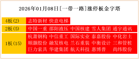 一共有22支个股涨停。其中,志特新材、快意电梯4板;中国一重、邵阳液压、中国核建、雪人集团、通宇通讯2板;杭萧钢构、中信重工、国际实业、泰嘉股份、中化岩土、顺灏股份、融发核电、兰石重装、中衡设计、三和管桩、巨力索具、华建集团、航天科技、惠博普、尚纬股份1板。