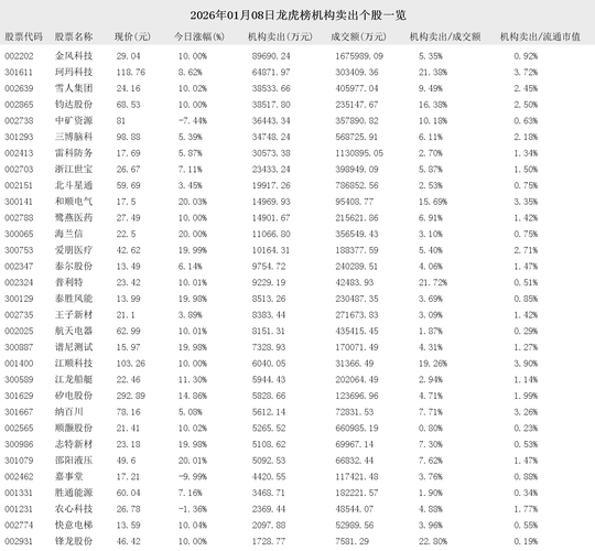 2026年01月08日盘后龙虎榜公开信息中,有63支股票出现了机构的身影。其中,有31支股票出现了机构买入,32支股票出现了机构卖出。