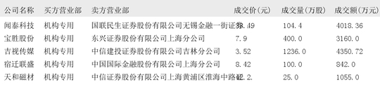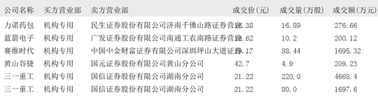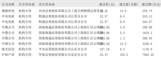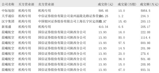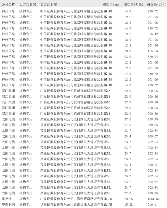 今日大宗交易榜单中出现机构买入席位的个股为:神州信息、滨江集团、太阳电缆、比亚迪、华森制药、中际旭创、天孚通信、汉宇集团、新易盛、晨曦航空、飞荣达、海川智能、宁德时代、南凌科技、玉马科技、力诺药包、蓝箭电子、赛维时代、黄山谷捷、三一重工、闻泰科技、宝胜股份、吉视传媒、宿迁联盛、天和磁材、翔港科技、中电电机、中微公司、海光信息、沪硅产业、云路股份、航天软件。