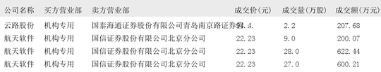 航天软件今日机构专用买入席位为3席,成交量共64.00万股,成交额共1422.72万元,成交额占流通市值比例为1931.16%。