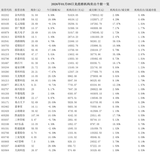 2026年01月09日盘后龙虎榜公开信息中,有67支股票出现了机构的身影。其中,有35支股票出现了机构买入,32支股票出现了机构卖出。
