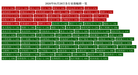 今日涨幅居前的行业有:黄金(9.25%)、铅锌(8.25%)、铜(6.01%)、铝(4.76%)、煤炭(4.44%)、电信运营(4.14%)、石油(3.97%)、染料涂料(3.18%)、种植业(2.53%)、农药化肥(2.0%)。