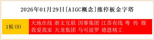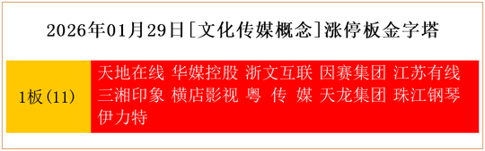 一共有11支个股涨停。其中,天地在线、华媒控股、浙文互联、因赛集团、江苏有线、三湘印象、横店影视、粤 传 媒、天龙集团、珠江钢琴、伊力特1板。
