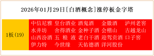 一共有19支个股涨停。其中,中信尼雅、皇台酒业、酒鬼酒、金徽酒、泸州老窖、水井坊、舍得酒业、金种子酒、会稽山、古越龙山、山西汾酒、五 粮 液、老白干酒、迎驾贡酒、口子窖、伊力特、今世缘、天佑德酒、洋河股份1板。