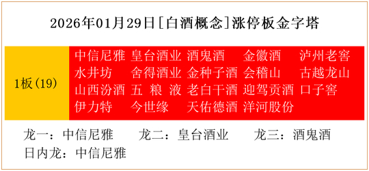 1板(19):中信尼雅、皇台酒业、酒鬼酒、金徽酒、泸州老窖、水井坊、舍得酒业、金种子酒、会稽山、古越龙山、山西汾酒、五 粮 液、老白干酒、迎驾贡酒、口子窖、伊力特、今世缘、天佑德酒、洋河股份。