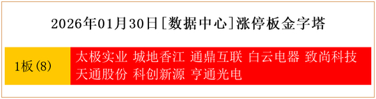 一共有8支个股涨停。其中,太极实业、城地香江、通鼎互联、白云电器、致尚科技、天通股份、科创新源、亨通光电1板。