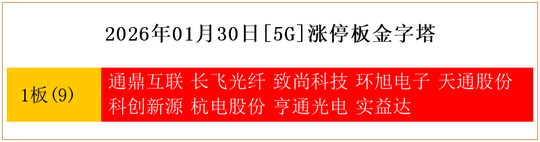 一共有9支个股涨停。其中,通鼎互联、长飞光纤、致尚科技、环旭电子、天通股份、科创新源、杭电股份、亨通光电、实益达1板。