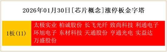 一共有11支个股涨停。其中,太极实业、柏诚股份、长飞光纤、致尚科技、利通电子、环旭电子、东材科技、天通股份、亨通光电、实益达、万盛股份1板。