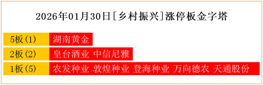 一共有8支个股涨停。其中,湖南黄金5板;皇台酒业、中信尼雅2板;农发种业、敦煌种业、登海种业、万向德农、天通股份1板。