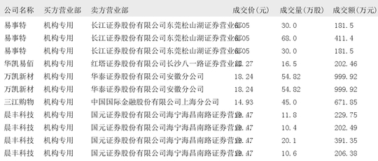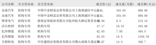 今日大宗交易榜单中出现机构买入席位的个股为:众泰汽车、博菲电气、沃尔核材、亿纬锂能、天银机电、易事特、华凯易佰、万凯新材、三江购物、晨丰科技、龙芯中科、拉普拉斯。