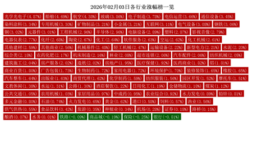 今日涨幅居前的行业有:光学光电子(4.87%)、船舶(4.69%)、航空(4.38%)、玻璃(3.86%)、电子制造(3.78%)、电信运营(3.66%)、通信设备(3.45%)、染料涂料(3.34%)、专用机械(3.3%)、矿物制品(3.21%)。