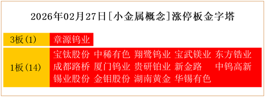 一共有15支个股涨停。其中,章源钨业3板;宝钛股份、中稀有色、翔鹭钨业、宝武镁业、东方锆业、成都路桥、厦门钨业、贵研铂业、新金路、中钨高新、锡业股份、金钼股份、湖南黄金、华锡有色1板。