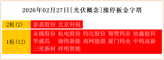 一共有14支个股涨停。其中,泰嘉股份、北京科锐2板;永臻股份、杭电股份、钧达股份、翔鹭钨业、协鑫能科、华盛昌、珈伟新能、南网能源、厦门钨业、中钨高新、三星新材、祥明智能1板。