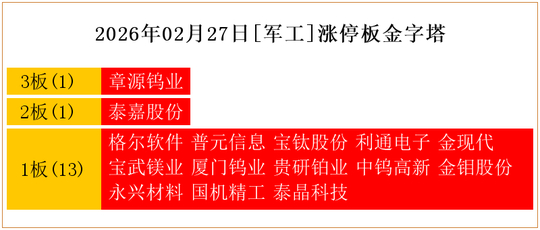 一共有15支个股涨停。其中,章源钨业3板;泰嘉股份2板;格尔软件、普元信息、宝钛股份、利通电子、金现代、宝武镁业、厦门钨业、贵研铂业、中钨高新、金钼股份、永兴材料、国机精工、泰晶科技1板。