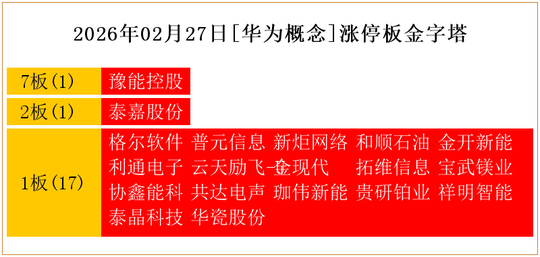 一共有19支个股涨停。其中,豫能控股7板;泰嘉股份2板;格尔软件、普元信息、新炬网络、和顺石油、金开新能、利通电子、云天励飞-U、金现代、拓维信息、宝武镁业、协鑫能科、共达电声、珈伟新能、贵研铂业、祥明智能、泰晶科技、华瓷股份1板。