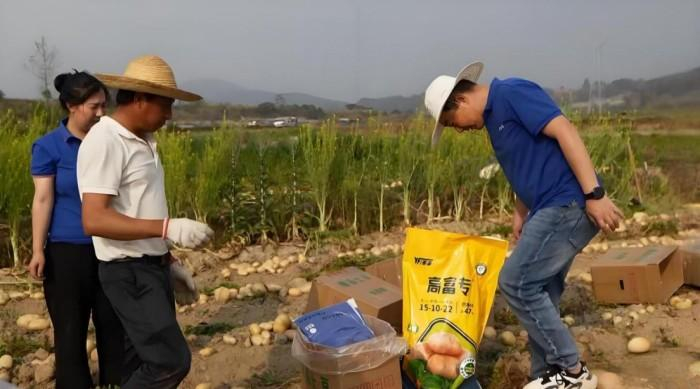 左为新洋丰滇南分公司农化老师 张小涵,右为云南芒市马铃薯种植户 冯岩保坐。为了摆脱“看天吃饭”的困境,老冯主动找到了新洋丰团队,希望获得专业的施肥方案和田间管理指导。了解到他的需求后,新洋丰迅速响应,从施底肥的关键节点开始,便全程跟进服务。新洋丰农技人员结合老冯田块的土壤特性和种植习惯,量身定制科学施肥方案,并提供全天候的田间管理指导,无论是土壤改良还是生长异常,都能在第一时间给出专业解答。