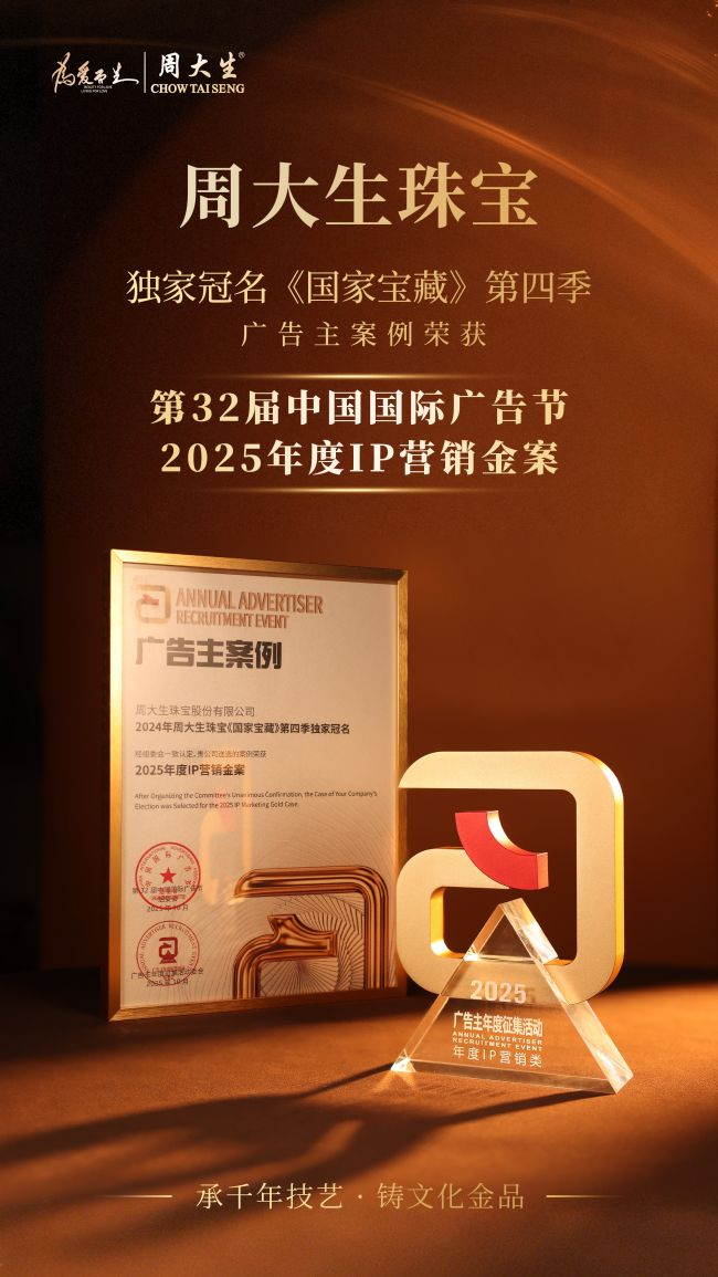 近日,在第32届中国国际广告节上,周大生珠宝凭借“2024年周大生珠宝《国家宝藏》第四季独家冠名”项目,成功斩获“2025年度IP营销金案”大奖。这一殊荣不仅是行业对周大生品牌创新营销成果的高度认可,更标志着其以文化赋能品牌、以创新驱动增长的战略实践,已成为珠宝行业融合传统文化与现代商业价值的标杆典范。