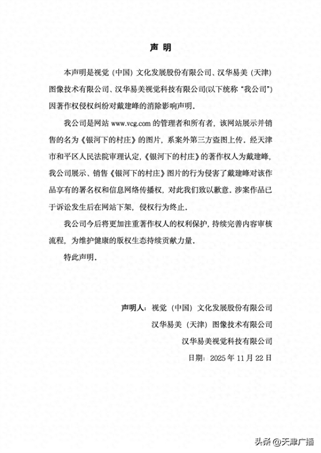 声明称,视觉中国管理的网站展示并销售的名为《银河下的村庄》的图片,系案外第三方盗图上传。经天津市和平区人民法院审理认定,《银河下的村庄》的著作权人为戴建峰。视觉中国展示、销售《银河下的村庄》图片的行为侵害了戴建峰对该作品享有的署名权和信息网络传播权,对此我们致以歉意。涉案作品已于诉讼发生后在网站下架,侵权行为终止。