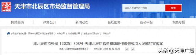 近日,天津市北辰区市场监督管理局发布《行政处罚决定书:津北辰市监处罚〔2025〕308号-天津北辰区椒盐棋牌馆作虚假或引人误解的宣传案》。