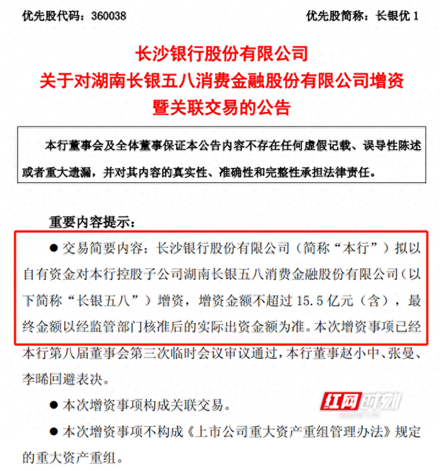 长沙银行公告表示,本次增资能进一步充实长银五八资本,增强其风险抵御能力,为其持续稳健经营创造条件。