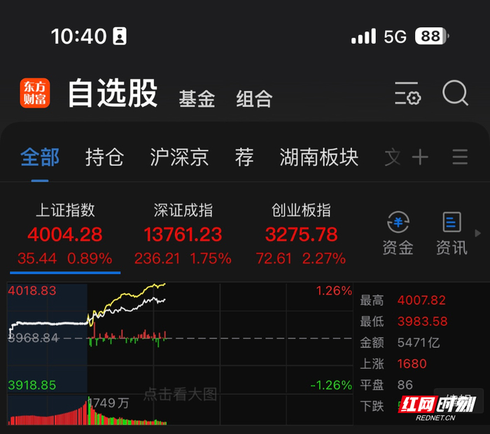 红网时刻新闻1月5日讯(记者 郭雅倩)1月5日,A股首个交易日开启,三大股指集体飘红。盘中,沪指拉升涨超0.8%,时隔34个交易日,上证指数盘中重回4000点。东方财富数据显示,截至发稿,沪指涨0.89%,到4004.28点,深证成指涨1.75%,到13761.23点,创业板指涨2.27%,到3275.78点。行业板块上,保险、医疗器械、医疗服务、电子化学品、半导体、游戏板块涨幅居前。湖南板块,超7成湘股飘红,飞沃科技上涨约13%,湖南白银、可孚医疗、华曙高科、大湖股份、宇晶股份、蓝思科技均涨超6%。