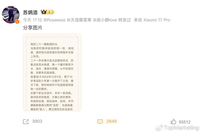 苏炳添退役长文,向下滑动查看,图源苏炳添微博