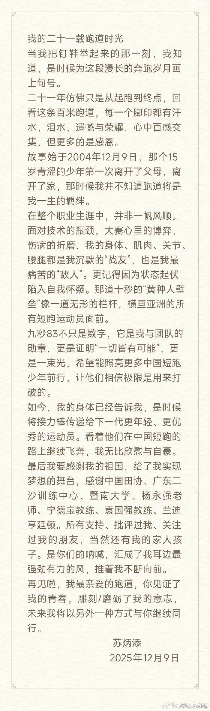 从2004年12月9日到2025年12月9日,二十一载跑道时光,从起点到终点,苏炳添创造了10次突破10秒大关的里程碑,也开创了亚洲“9秒83”的传奇,被网友亲切称为“苏神”。在退役博文推送后,# 词条在热搜上爆了,网友、品牌、明星也齐刷刷到该条博文下评论。