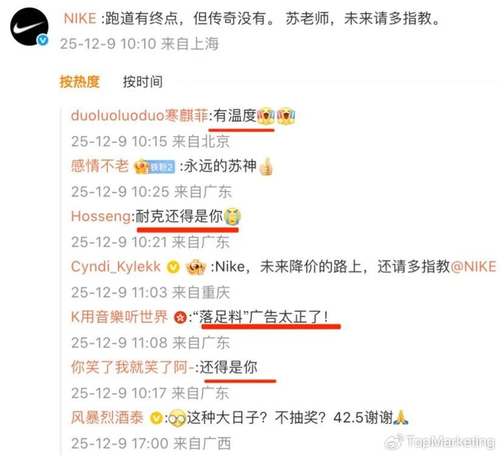 纵观“苏神”退役微博的2600多条评论中,NIKE、伊利、立白、小米等品牌的致敬文案赚足好感,且有三条品牌文案冲进评论区热度榜TOP5。截至发稿,耐克的文案更是以4050点赞量拿下第一。
