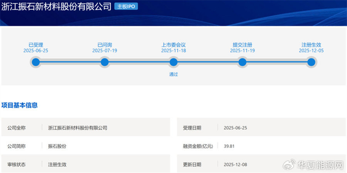 华夏能源网&零碳资本论获悉,12月5日,浙江振石新材料股份有限公司(以下简称“振石股份”)走完IPO前的最后一道流程——注册生效,下一步公司将在上交所挂牌上市。