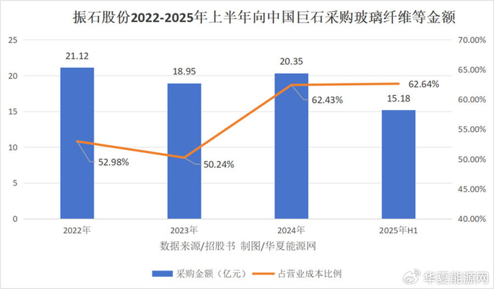 2022年到2025年上半年,振石股份向中国巨石的玻璃纤维等采购金额分别为21.12亿元、18.95亿元、20.35亿元和15.18亿元,占营业成本的52.98%、50.24%、62.43%、62.64%。这意味着,振石股份每花1块钱,就有6毛钱流向了中国巨石。