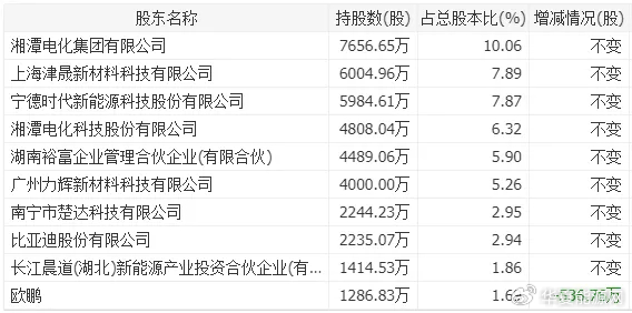 截至今年三季度末,宁德时代直接持有湖南裕能7.78%股份,位列第三大股东,并通过长江晨道间接持有1.86%股份;比亚迪直接持有湖南裕能2.94%股份,位列第八大股东。