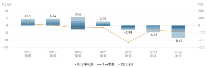 2018年至2024年美克家居归母净利润情况(亿元、%)