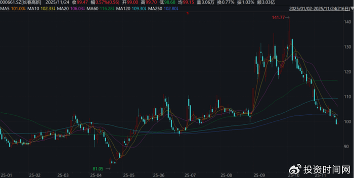 不过,受集采降价和生长激素市场竞争加剧影响,公司此后股价连续四年下跌。截至2025年11月24日午盘,长春高新股价报98.79元/股(不复权),总市值约为403亿元,较2021年最高值已蒸发超1700亿元。