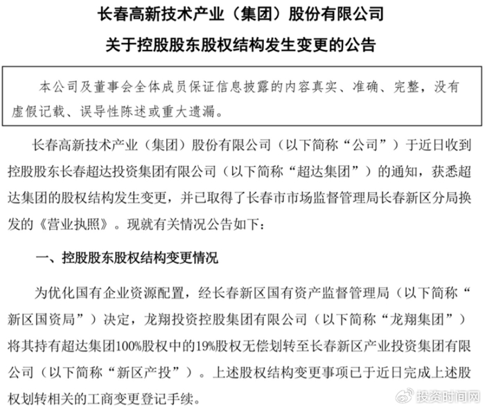 长春高新发布公告称,公司控股股东长春超达投资集团有限公司(下称超达集团)19%股权将由龙翔投资控股集团有限公司无偿划转至长春新区产业投资集团有限公司。调整变更前,龙翔集团持有超达集团100%股权,划转后,龙翔集团与新区产投分别持有超达集团81%与19%的股权。从股权结构来看,上述股权变更并未改变超达集团的控股股东地位,长春高新实际控制人仍为新区国资局。