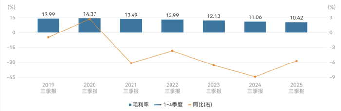 Wind数据显示,2021年至2024年及2025年的前三季度,上海医药营业收入增速分别为14.72%、8.47%、13.11%、6.14%、2.60%,今年前三季度,公司营收增速已降至近年最低水平。从毛利率指标来看,2020年至2024年以及2025年前三季度末,公司的销售毛利率分别为14.30%、13.23%、13.14%、12.04%、11.13%、10.42%,呈持续下滑趋势。