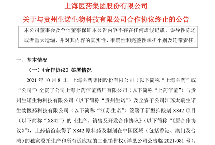 基于对外部市场的综合评估,上海医药子公司正式终止与贵州生诺及其关联方关于新型抑酸剂X842项目的合作协议