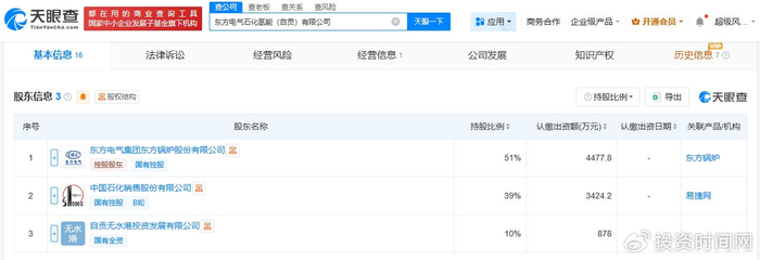 天眼查App显示,近日,东方电气石化氢能(自贡)有限公司成立,法定代表人为张章,注册资本8780万人民币,经营范围包括燃气经营、食品销售、太阳能发电技术服务、新兴能源技术研发、站用加氢及储氢设施销售等。股东信息显示,该公司由东方电气集团东方锅炉股份有限公司、中国石化销售股份有限公司、自贡无水港投资发展有限公司共同持股。