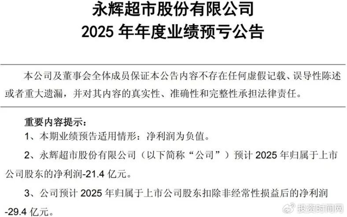 自2024年5月正式引入胖东来管理模式以来,永辉超市股份有限公司(下称永辉超市,601933.SH)已历经一年半的实践探索。近日,该公司公布了持续调改下的全年“成绩单”。经公司财务部门初步测算,永辉超市预计2025年归母净利润为-21.4亿元,扣除非经常性损益后的净利润为-29.4亿元,尚未止亏。