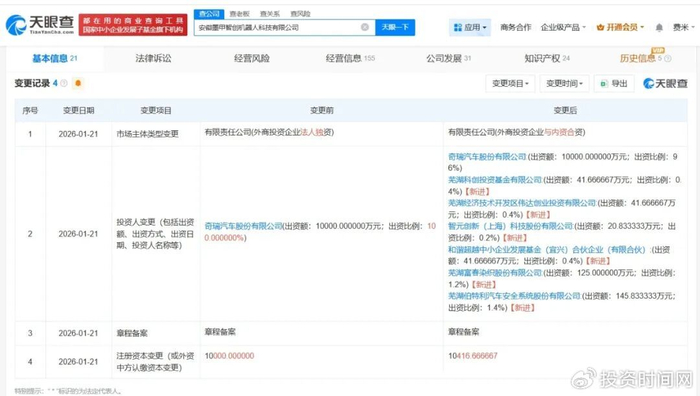 安徽墨甲智创机器人科技有限公司成立于2025年1月,法定代表人为张贵兵,经营范围包括智能机器人销售、智能机器人的研发、工业机器人制造等。股东信息显示,该公司由奇瑞汽车(09973.HK)及上述新增股东共同持股。