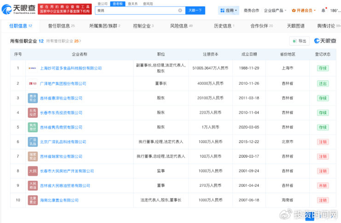 天眼查App显示,柴琇名下共关联10余家企业,其中5家为存续状态,包括上海妙可蓝多食品科技股份有限公司、广泽地产集团股份有限公司等,柴琇在上述企业中担任董事长、总经理等职务,版图涉及食品、地产、投资等。