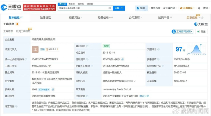 河南安井食品有限公司成立于2018年10月,法定代表人为江猛,经营范围包括速冻食品制造、肉制品及副产品加工、水产品及制品加工等。