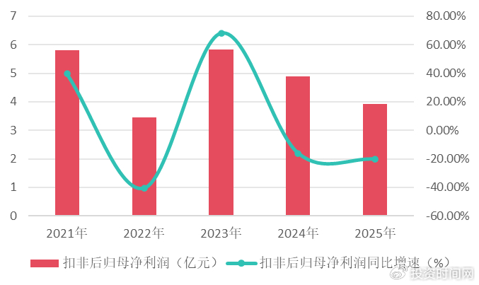 而公司归母净利润大涨并非源于主营业务,主要系参股公司悍高集团(001221.SZ)于2025年7月上市,公司公允价值变动损益增加2.53亿元所致。若扣除非经常性损益,公司归母净利润为3.92亿元,下滑20.06%。这是兔宝宝连续第二年遭遇扣非后归母净利润下降。