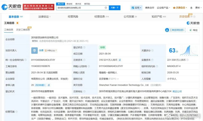 深圳跃然创新科技有限公司成立于2021年8月,法定代表人为李勇,经营范围含玩具销售、软件开发、移动终端设备制造等。