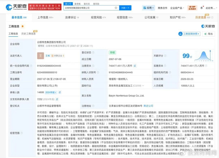 天眼查工商信息显示,近日,白银有色(601212.SH)发生工商变更,王普公卸任法定代表人、董事长,由王彬接任,同时,部分高管也发生变更。