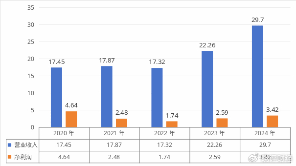 2020年至2024年,丸美生物分别实现营业收入17.45亿元、17.87亿元、17.32亿元、22.26亿元、29.7亿元,同比增长-3.1%、2.41%、-3.1%、28.52%、33.44%;净利润4.64亿元、2.48亿元、1.74亿元、2.59亿元、3.42亿元,同比增长-9.81%、-46.61%、-29.74%、48.93%、31.69%。